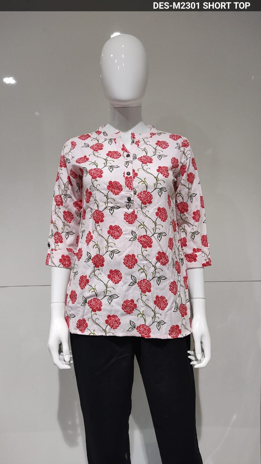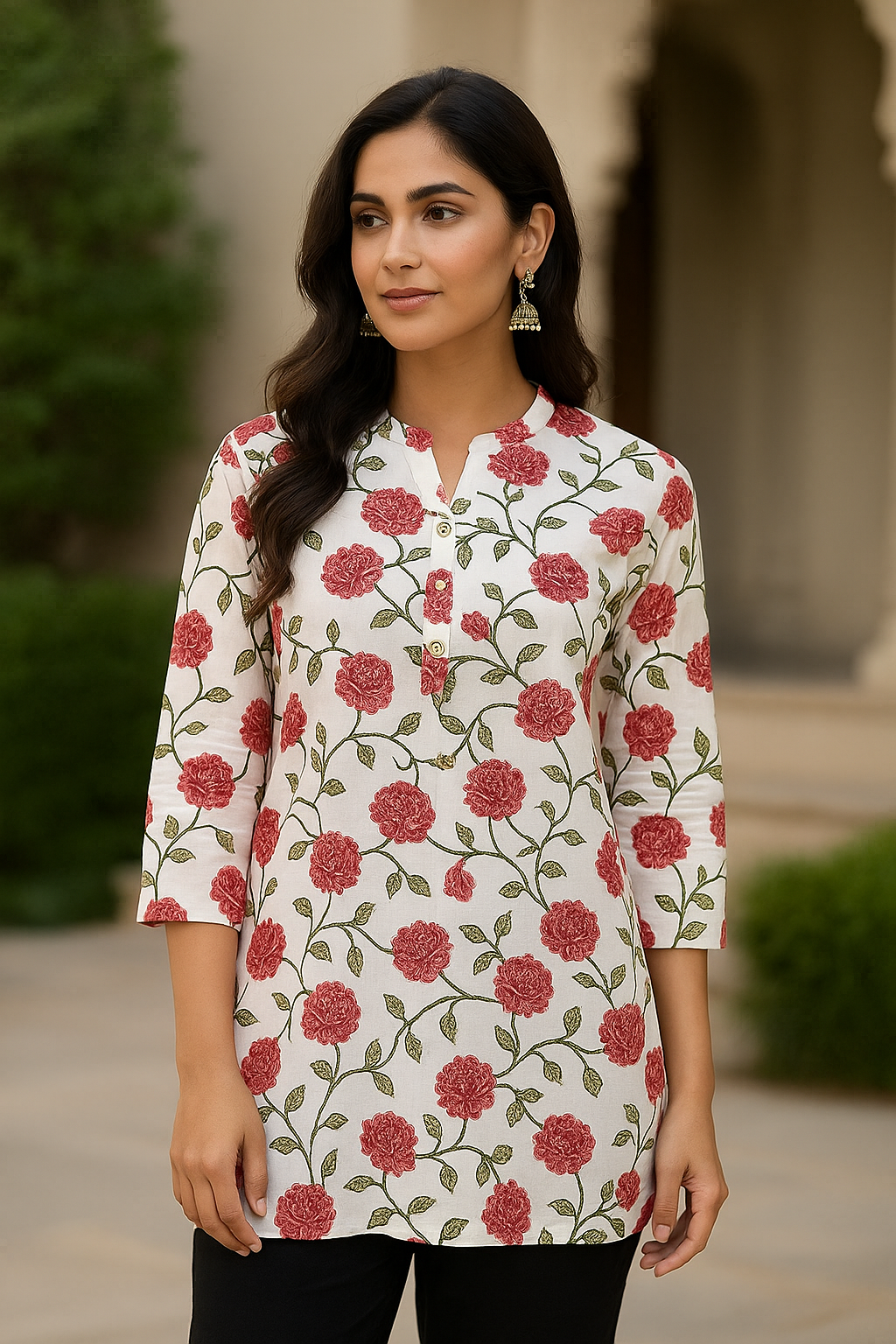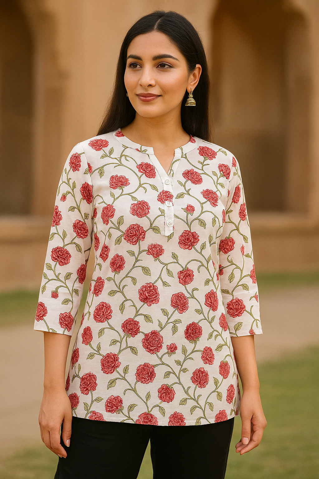 Bring effortless grace to your daily wear with this floral printed ivory kurti, crafted from 100% pure cotton that ensures comfort, breathability, and ease all day long. Featuring a stunning pattern of blooming red flowers and soft green vines, this kurti captures a refreshing, nature-inspired elegance. The notched neckline with button detailing adds a chic and structured appeal.